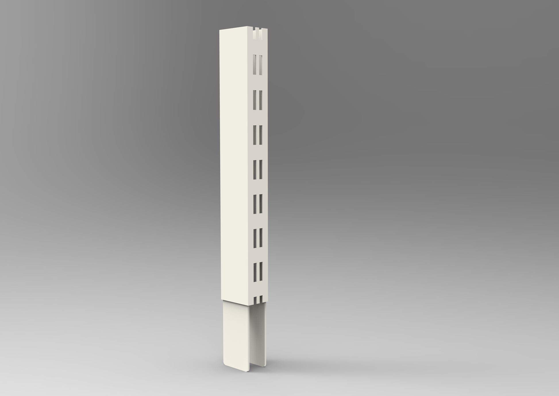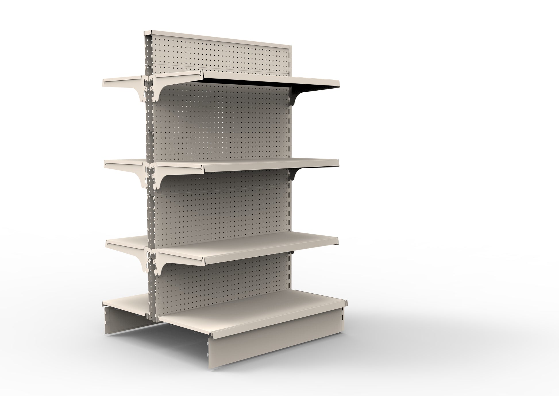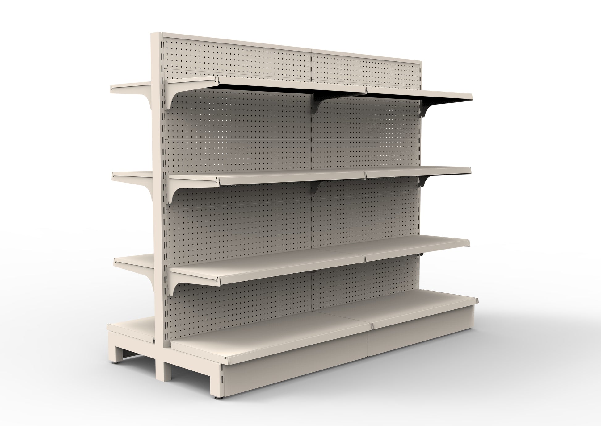 Description: Cream white retail shelving, double sided, with 8 shelves (2 base + 6 top shelves) including 8 price tags and 8 fences, 1 kick panel and 1 cap.