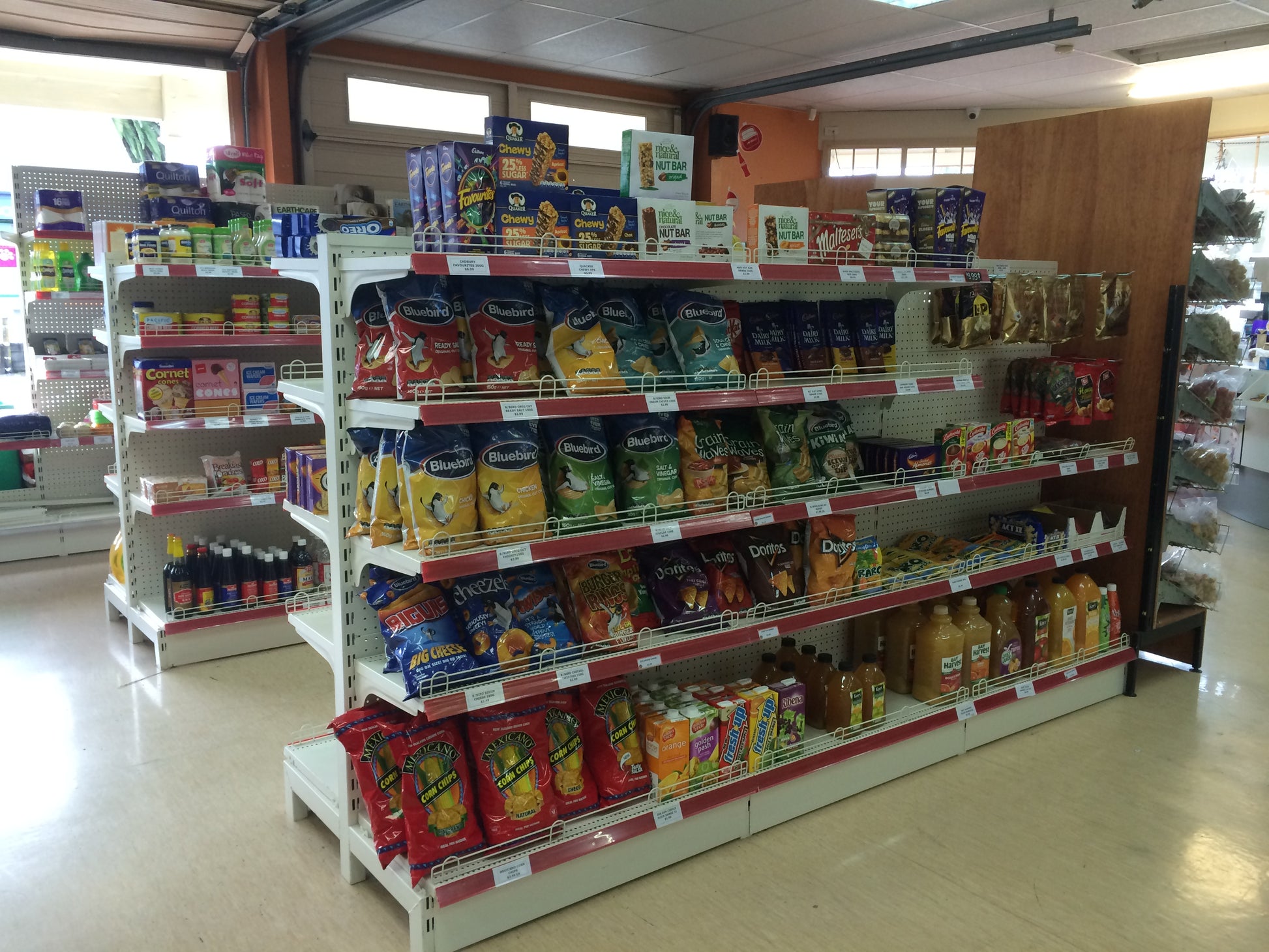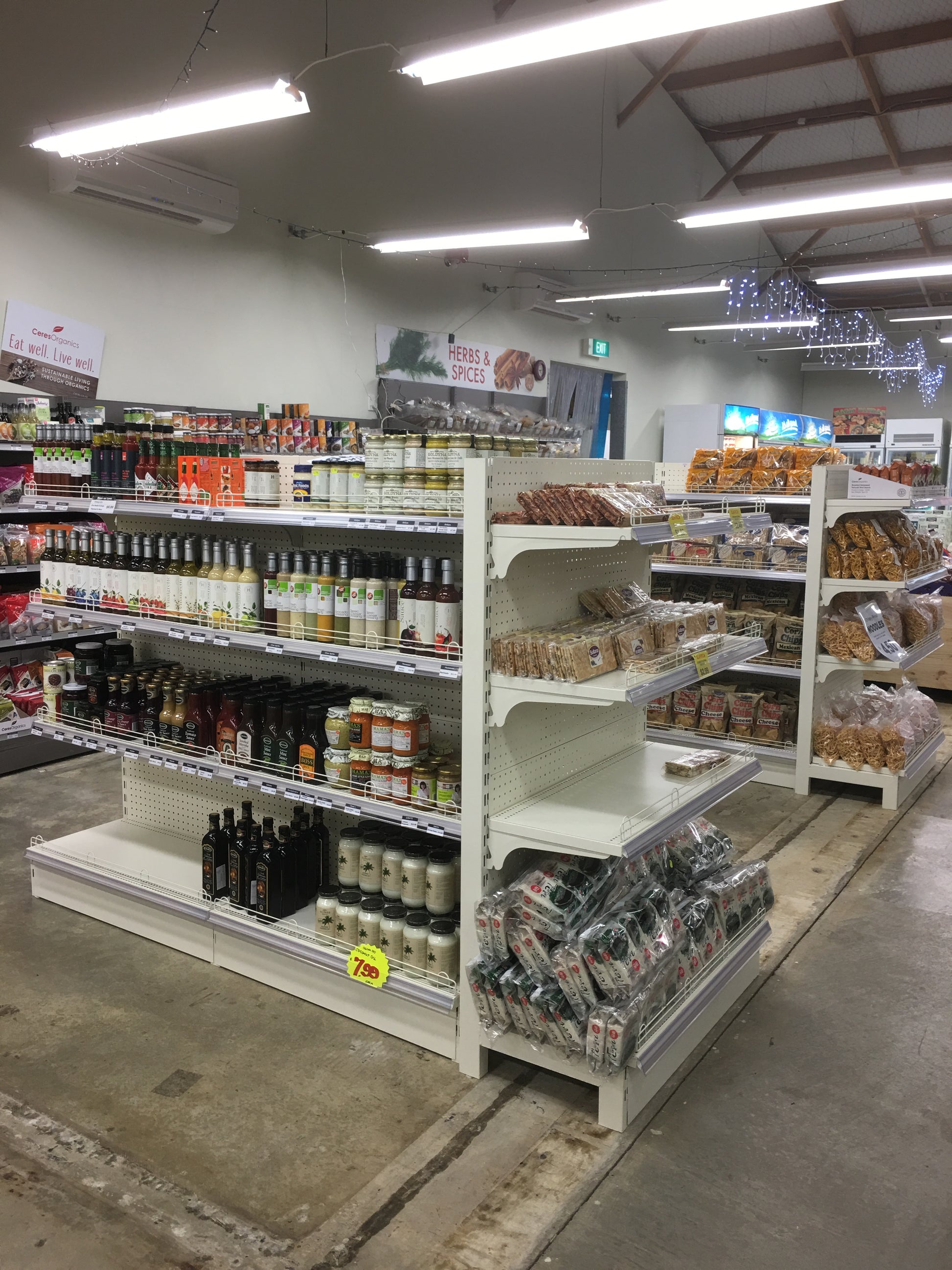 Description: Cream white retail shelving, double sided, with 8 shelves (2 base + 6 top shelves) including 8 price tags and 8 fences, 1 kick panel and 1 cap.