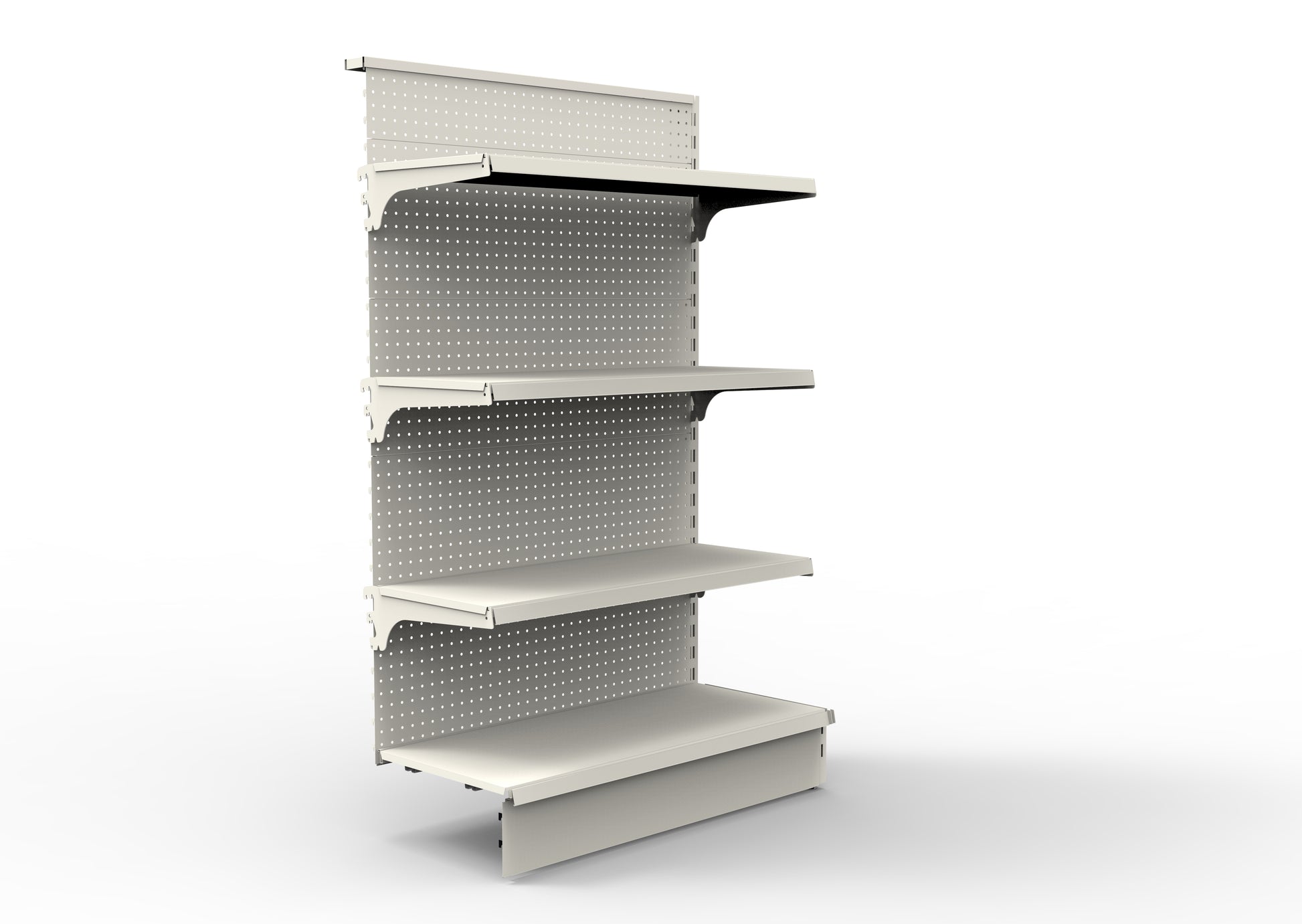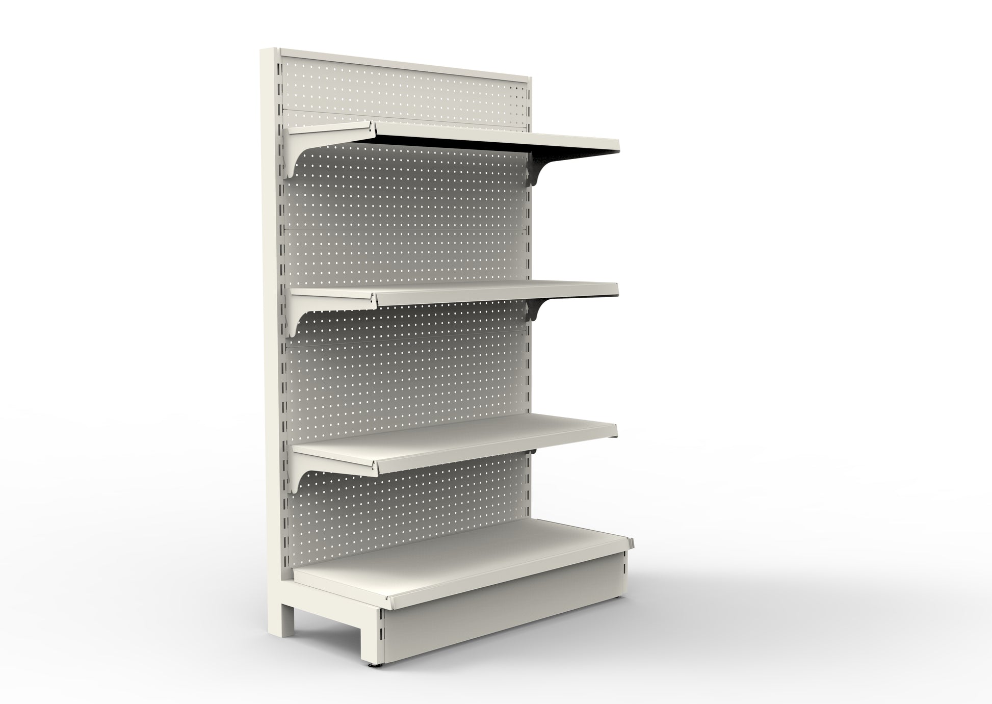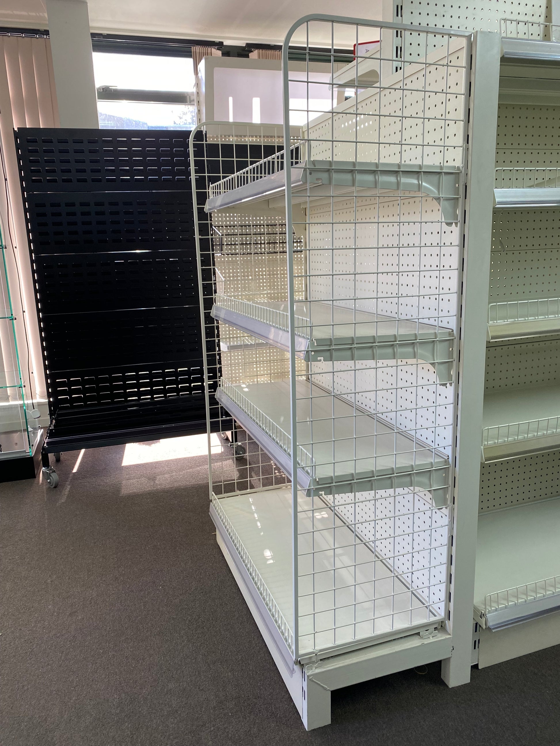 Description: Cream white retail shelving, single sided, with 4 shelves( 1 base + 3 top shelves) including 4 price tags and 4 fences, 1 kick panel and 1 cap.