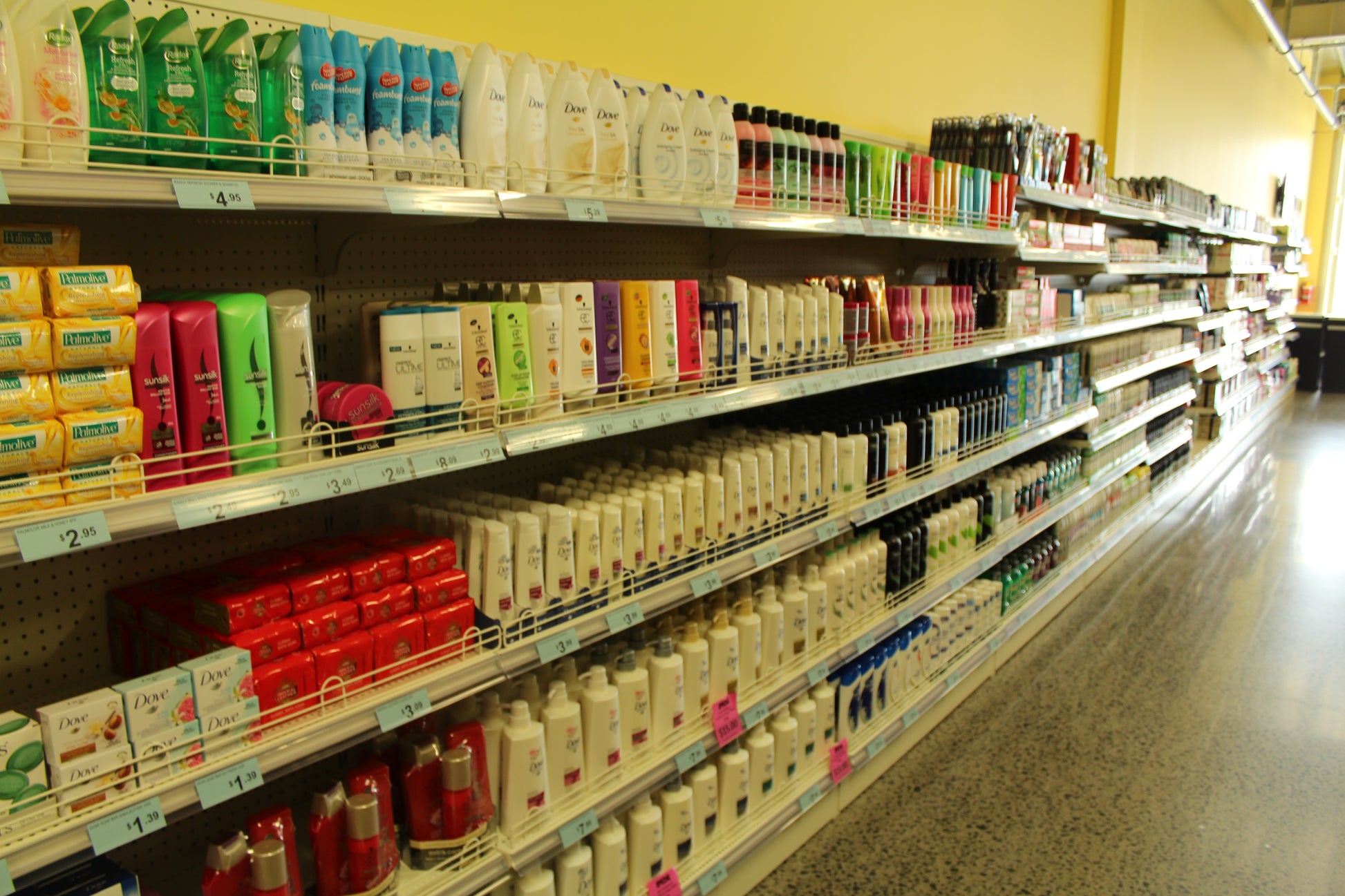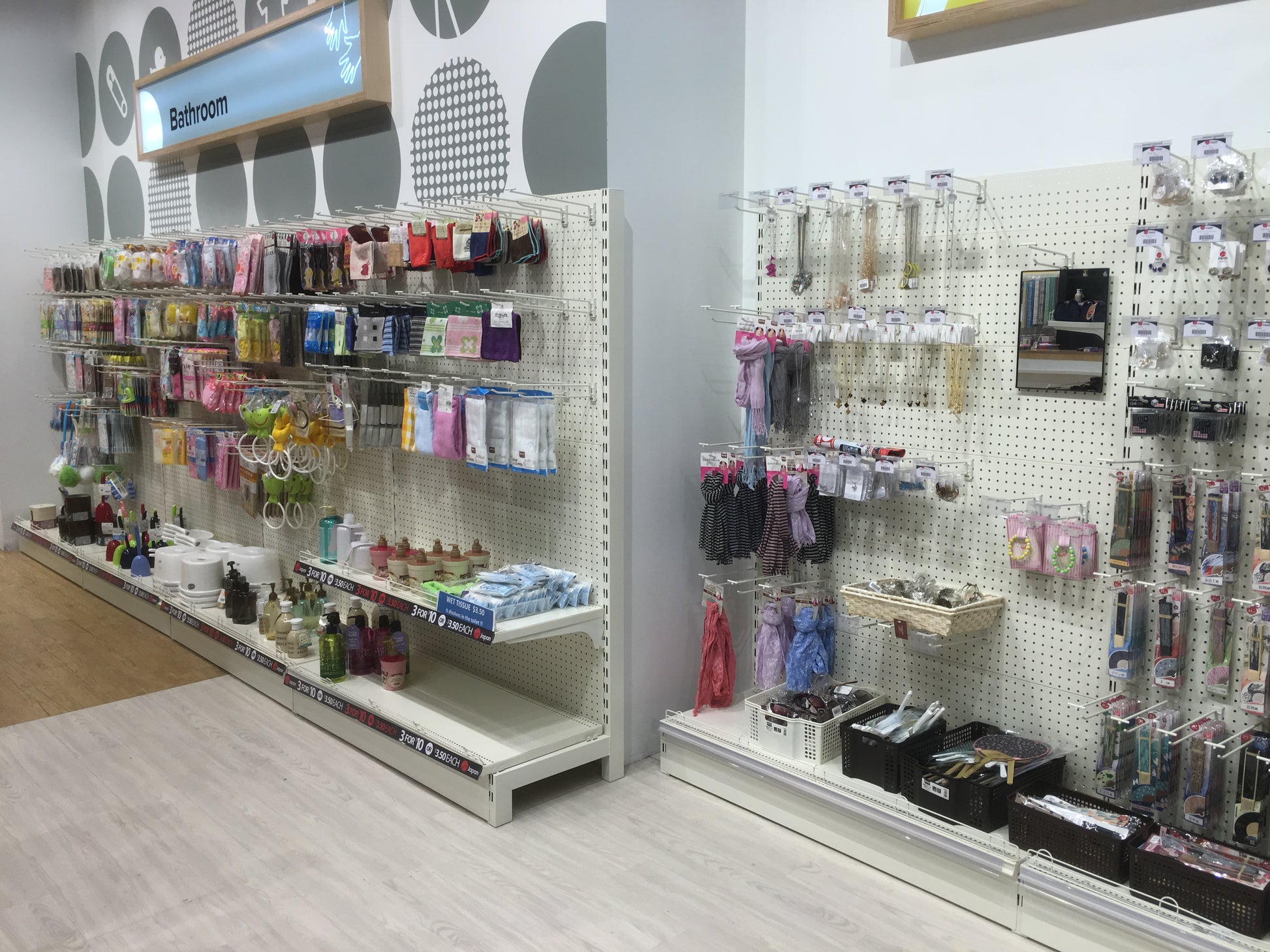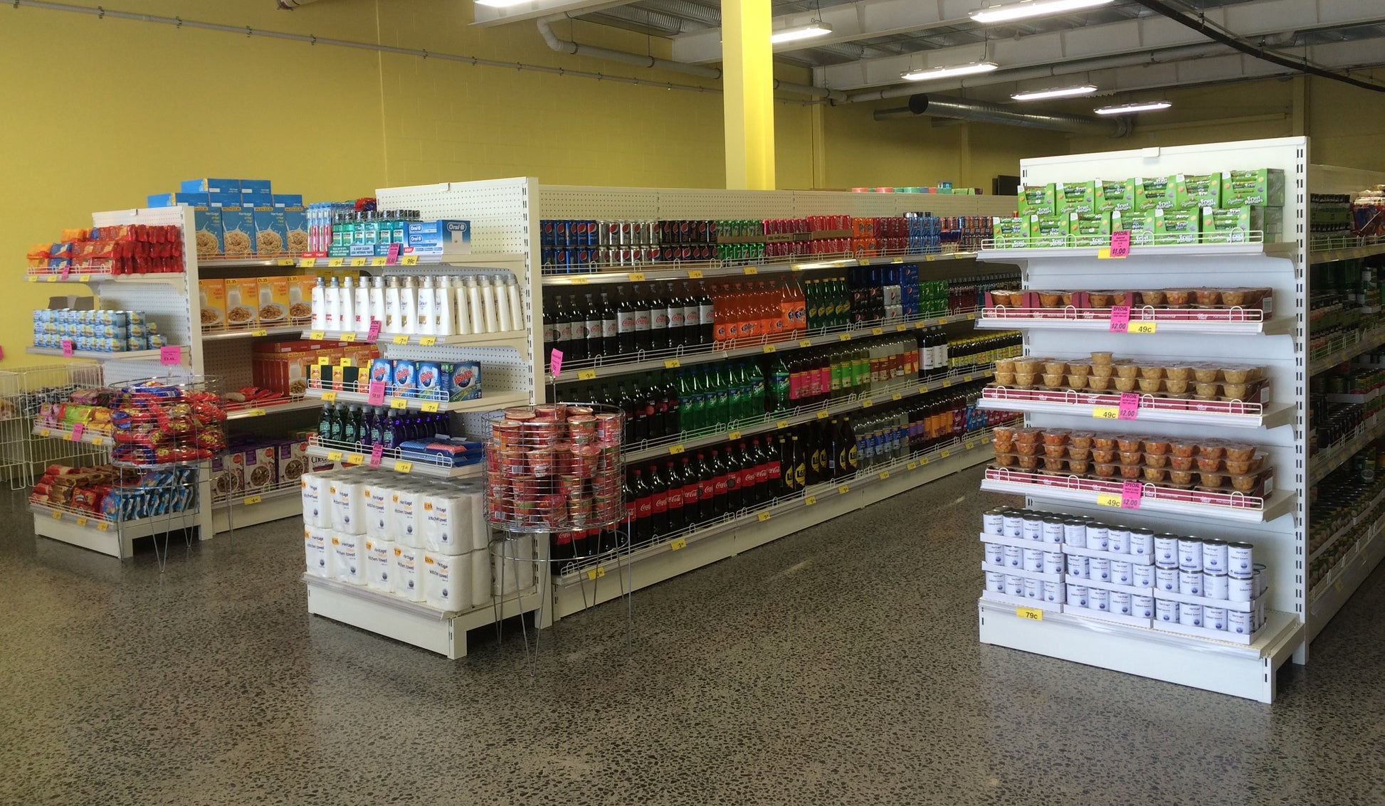 Description: Cream white retail shelving, single sided, with 4 shelves( 1 base + 3 top shelves) including 4 price tags and 4 fences, 1 kick panel and 1 cap.