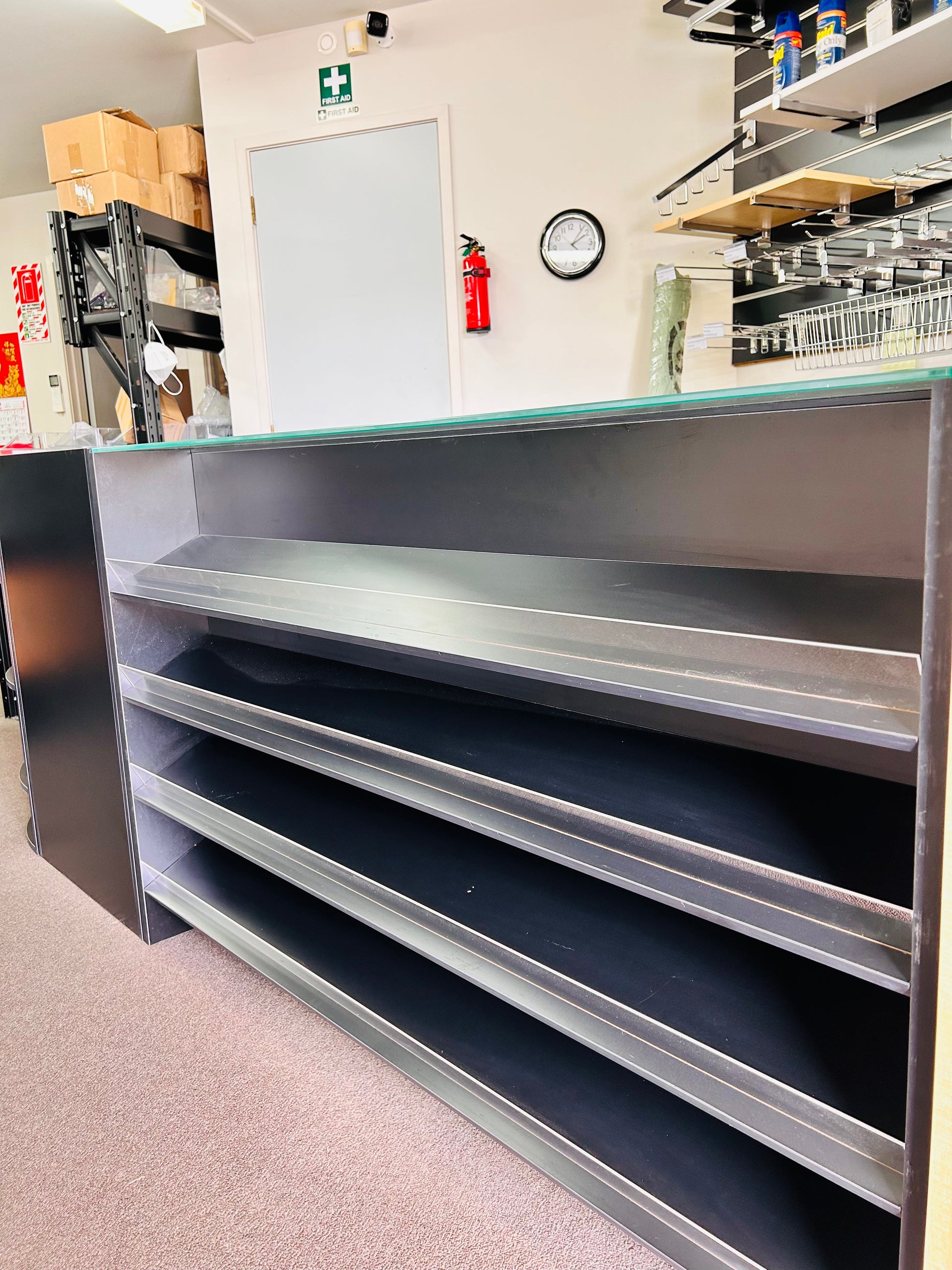 Description: Black wood table top, The 3 piece counter is made of a long table (1.5Lx0.5Wx0.95Hm), a small table (0.6Lx0.5Wx0.95Hm) and a corner table (0.5Lx0.5Wx0.95Hm)
