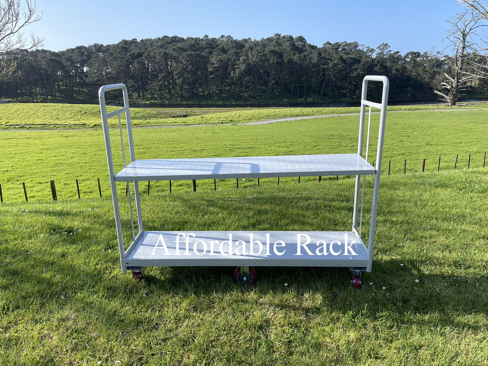Description: Platform U boat trolley with handles and 2 levels. 6 castors, 4 swivel 4" and 2 fixed 6" castors in the middle, with heavy duty base board. Customised for New World Southmall Auckland.