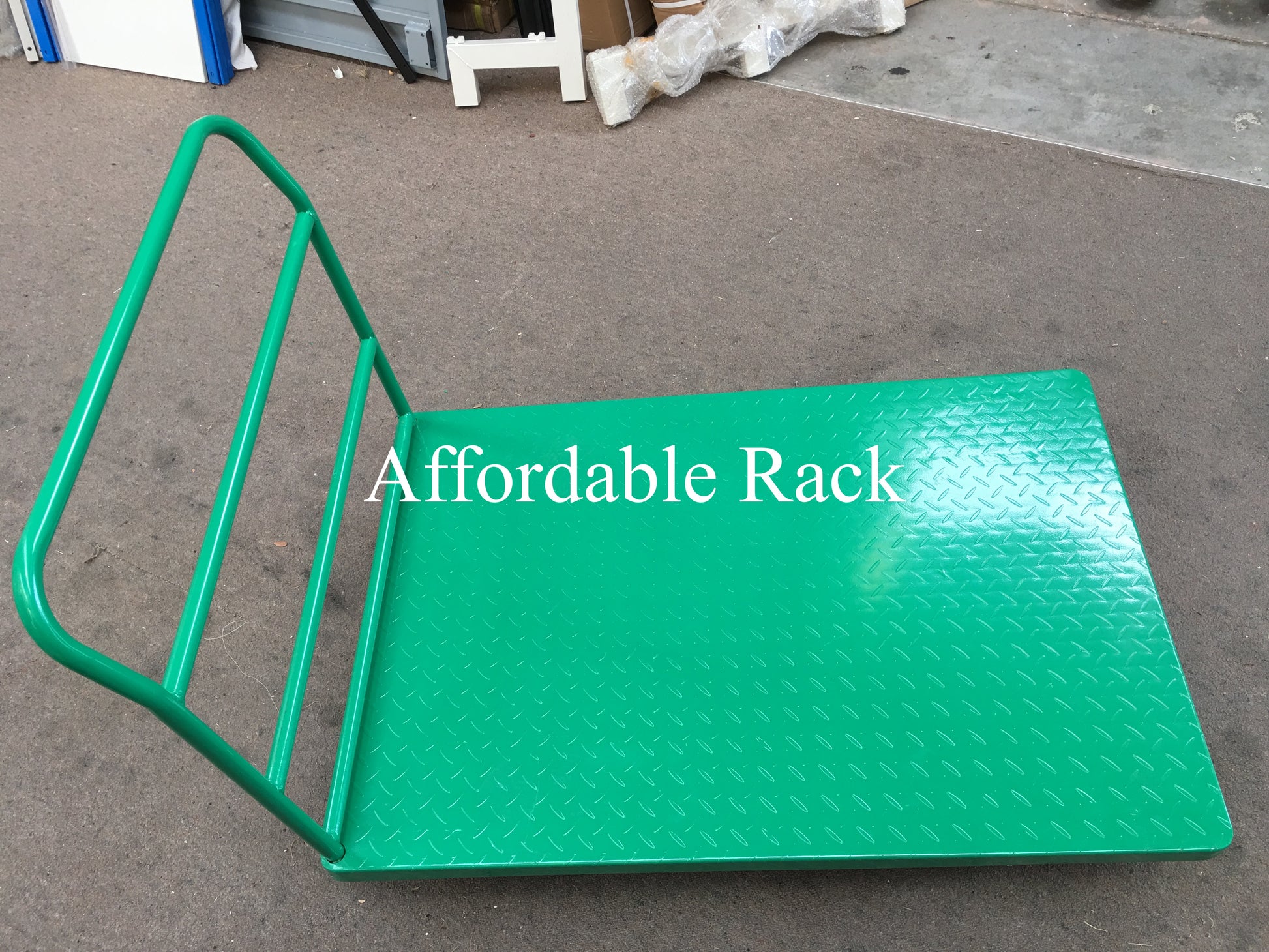 Description: Platform trolley with foldable handle, 2 reinforced ribs on the back, 2 fixed wheels and 2 directional wheels.