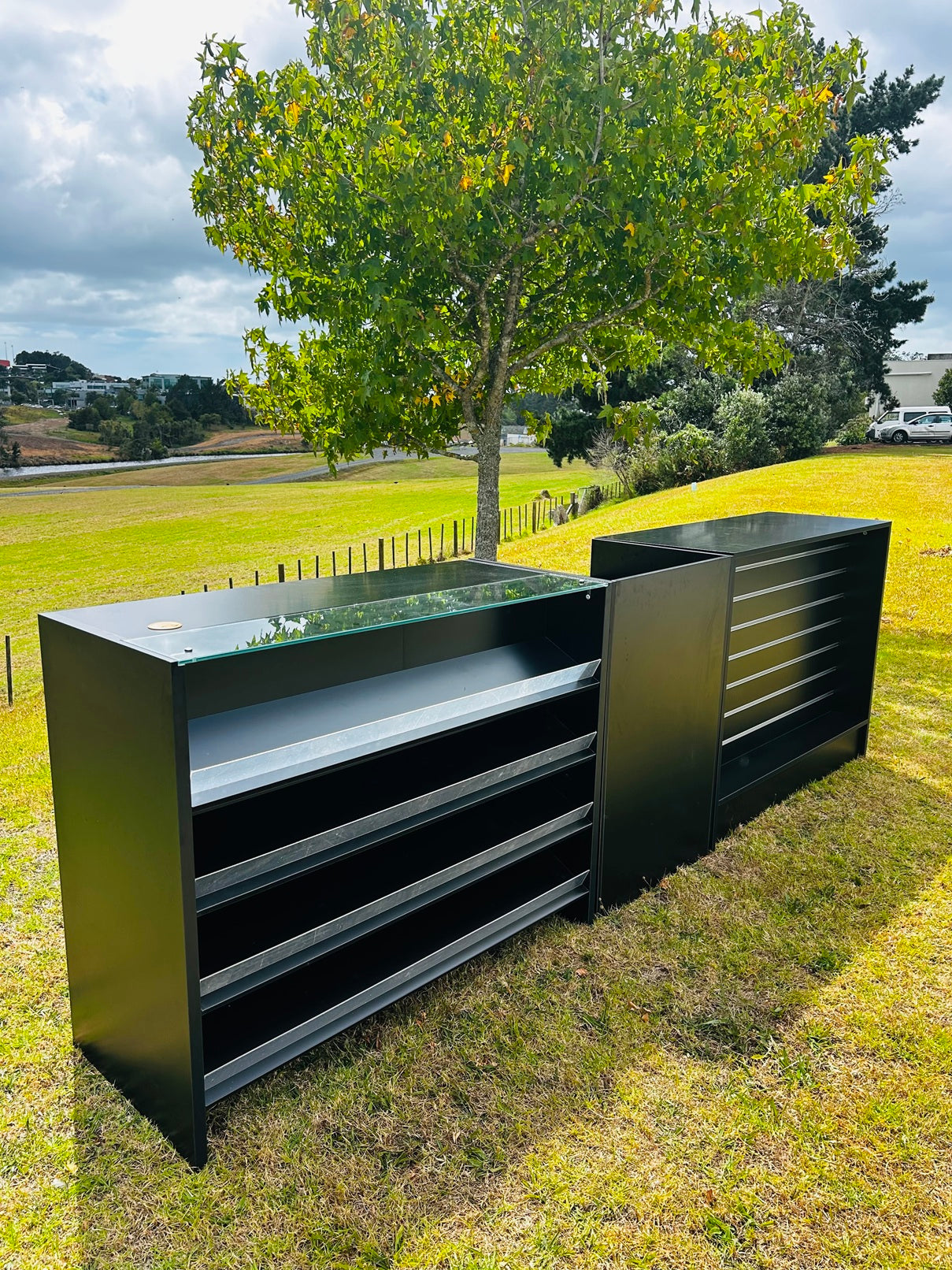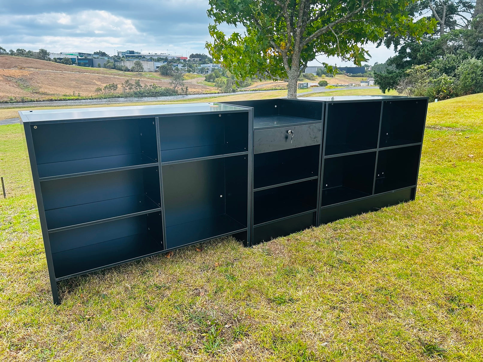 Description: Black wood table top, The 3 piece counter is made of 2 long table (1.5/1.2Lx0.5Wx0.85Hm Glass table or 1.2Lx0.5Wx0.95H), a small table (0.6Lx0.5Wx0.85Hm) and a computer table (0.6Lx0.5Wx0.85Hm)